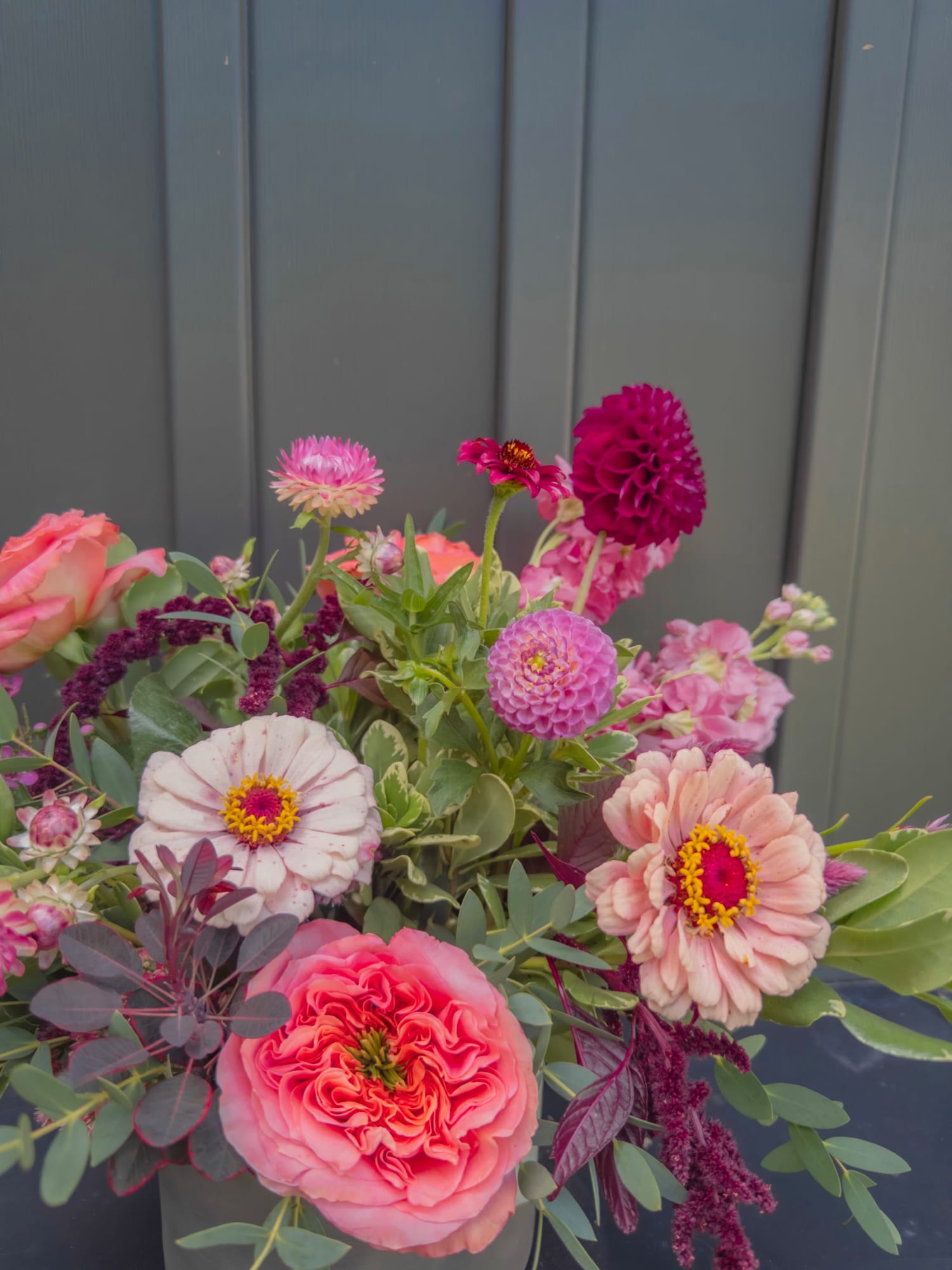 The growing season begins in spring, featuring locally grown anemones, ranunculus, tulips, and flowering branches — a cheerful start to the year. As summer arrives, we’re spoiled with abundance: celosia, zinnias, amaranthus, dahlias, and a variety of colorful, textural blooms fill our shop. Moving into autumn, we continue to enjoy the season’s richness with sedum, heirloom chrysanthemums, bittersweet, dahlias, and the final harvest of beautiful grasses and textures that add warmth and depth to our designs.